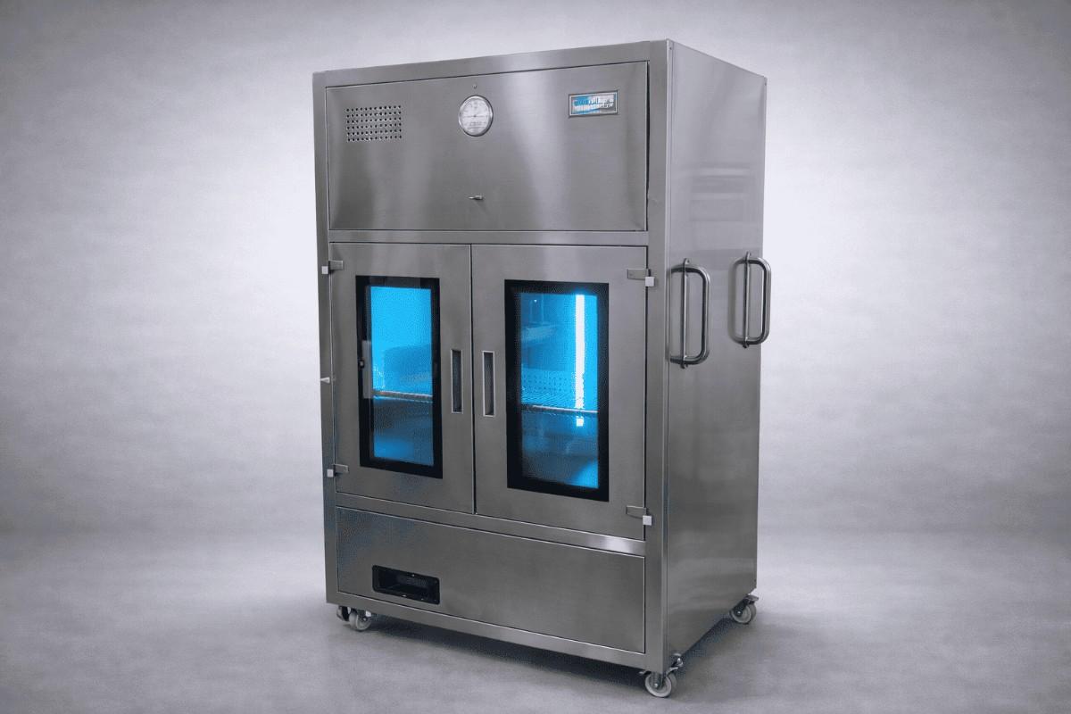Hygienic storage lockers for industrial and cleanroom use.